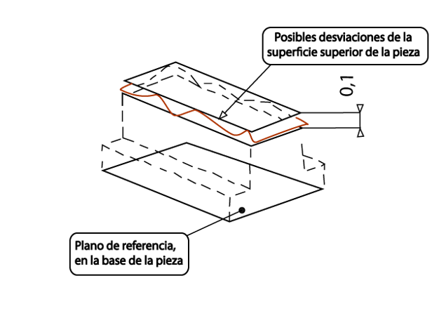 En el símbolo se utilizan 2 secciones, sección 1: indica la rectitud del filo de la cara superior que debe tener la pieza; sección 2: indica la desviación de esa rectitud con una tolerancia de: 0,1mm |
